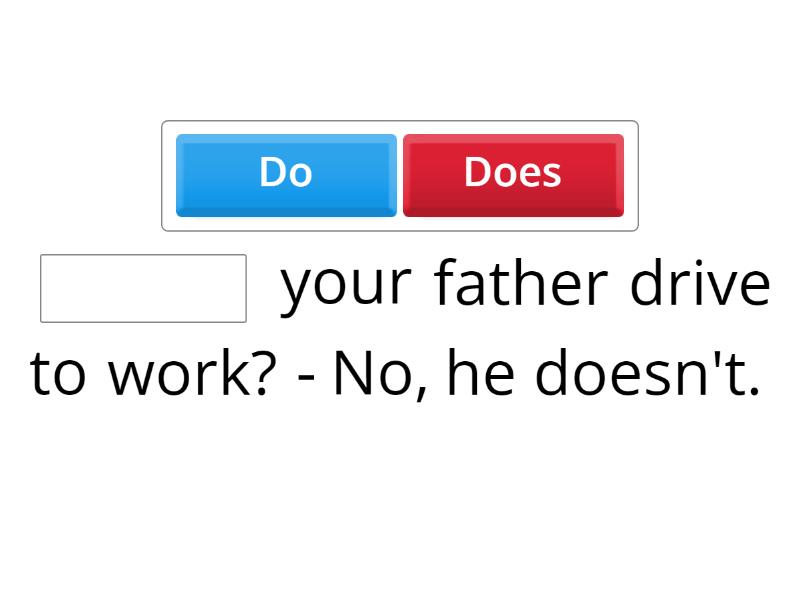____ your father drive to work? - No, he doesn't. ____ John and Helen ride their bikes to the playground? - Yes, they do ____ Alina walk to school? - Yes, she does ____ Bart take the train to work? - Yes, he does. ____ Clark and Sam drive to the pet shop? - Yes, they do.