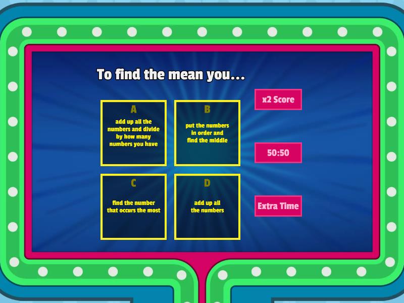 1) To find the mean you... a) add up all the numbers and divide by how many numbers you have b) put the numbers in order and find the middle c) find the number that occurs the most d) add up all the numbers 2) To find the median you... a) add up all the numbers and divide by how many numbers you have b) put the numbers in order and find the middle c) find the number that occurs the most d) add up all the numbers 3) To find the mode you... a) add up all the numbers and divide by how many numbers you have b) put the numbers in order and find the middle c) find the number that occurs the most d) add up all the numbers 4) If you are given the following numbers; 10, 11, 6, 5, and 8, what would be the correct MEAN? a) 2 b) 5 c) 3 d) 4 e) 8 f) 6 5) If you are given the following numbers; 10, 11, 6, 5, and 8, what would be the correct MEDIAN? a) 8 b) 11 c) 5 d) 10 e) 8 1/2 f) 6 6) If you are given the following numbers; 10, 11, 6, 5, and 8, what would be the correct MODE? a) 10 b) 11 c) There is no mode. d) 6 e) 5 f) 8 7) If you are given the following numbers; 6, 13, 4, 3, 11, 5, 3, 15, and 3, what would be the correct MEAN? a) 3 b) 2 c) 9 d) 5 e) 6 f) 7 8) If you are given the following numbers; 6, 13, 4, 3, 11, 5, and 3, what would be the correct MEDIAN? a) 7 b) 6 c) 5 d) 3 e) 11 9) If you are given the following numbers; 6, 13, 4, 3, 5, 3, and 3, what would be the correct MODE? a) 4 b) There is no mode. c) 3 d) 7 e) 13 f) 2 10) If you are given the following numbers; 7, 5, 14, 12, 2, 2, what would be the correct MEAN? a) 3 b) 6 c) 7 d) 4 e) 2 f) 5 11) If you are given the following numbers; 7, 5, 14, 12, 2, 2, what would be the correct MEDIAN? a) 6 b) 2 c) 3 d) 4 e) 9 12) If you are given the following numbers; 2, 2, 4, 2, 5, 2, 8, 1, and 1, what would be the correct MODE? a) 4 b) 7 c) 3 d) 1 e) 2 f) There is no mode. 13) What is the mean/balance point? a) 9 b) 4 c) 5 d) 36 14) What is the mean/balance point? a) 1.5 b) 2 c) 12 d) 8