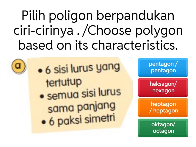 1) Pilih poligon berpandukan ciri-cirinya . /Choose polygon based on its characteristics. a) pentagon / pentagon b) heksagon/ hexagon c) heptagon / heptagon d) oktagon/ octagon 2) Pilih poligon berpandukan ciri-cirinya. /Choose polygon based on its characteristics a) segi tiga / triangle b) segi empat / quadrilateral c) heptagon / heptagon d) oktagon/ octagon 3) Pilih poligon berpandukan ciri-cirinya. /Choose polygon based on its characteristics a) segi empat / quadrilateral b) pentagon / pentagon c) heksagon / hexagon d) heptagon/ heptagon 4) Berapakah bilangan pepenjuru bagi poligon sekata yang ditunjukkan? / How many diagonals are there in the polygon? a) 3 b) 4 c) 5 d) 6 5) Berapakah bilangan pepenjuru bagi poligon sekata yang ditunjukkan?/ How many diagonals are there in the polygon? a) 6 b) 7 c) 8 d) 9 6) Berapakah bilangan pepenjuru bagi heptagon yang ditunjukkan? /How many diagonals are there in the heptagon? a) 5 b) 9 c) 14 d) 20 7) Berapakah bilangan pepenjuru bagi oktagon yang ditunjukkan? /How many diagonals are there in the octagon? a) 20 b) 14 c) 9 d) 5 8) Nyatakan bilangan sudut bagi bentuk segi tiga. / State the number of corners of triangle. a) 2 b) 3 c) 4 d) 5 9) Kira bilangan sisi bagi bentuk pentagon. / Count the number of side of pentagon. a) 4 b) 5 c) 6 d) 7 10) Nyatakan jumlah simetri bagi bentuk segi empat sama. / State the number of symmetrical axes of square. a) 2 b) 3 c) 4 d) 5