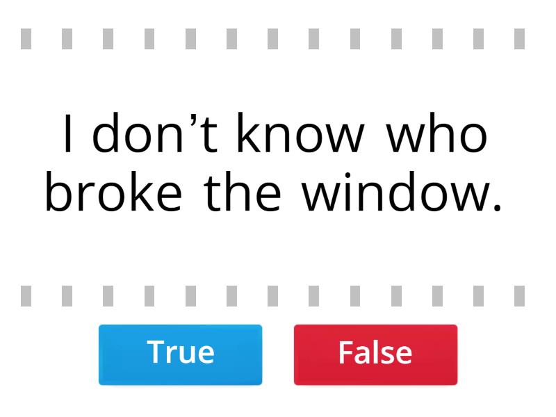 True: I don’t know who broke the window., Ben isn’t sure what is wrong., Jay wants to know what happened to Tim?, Do you know what Paul is looking at?, I have no idea who the girls are., Alice wants to know how the cat is., Tim has no idea what is in the box., Why did Susan make the cookies?, I asked why Susan made the cookies., Why does Mrs. White look sad?, Do you have any idea why Mrs. White looks sad?, What should we do now?, Does anyone know what we should do now?, How long has Joe been a nurse?, Please tell me how long Joe has been a nurse., Can you tell me where to go?, I have no idea who to ask for help., He is not sure whether he has enough money or not., I want to know if you can go to the party with me or not., Do you know whether Dolly has fed the dog?, Mrs. Lee isn’t sure if it will rain this afternoon., False: Mrs. Lee isn’t sure if it rains this afternoon., Can you tell me where going?, How long Joe has been a nurse?, Do you have any idea why does Mrs. white look sad?, Alice wants to know how is the cat., I don’t know who the window broke., Who the girls are?, Do you know whether Dolly has fed the dog., Mrs. Lee isn’t sure weather it rains this afternoon.,