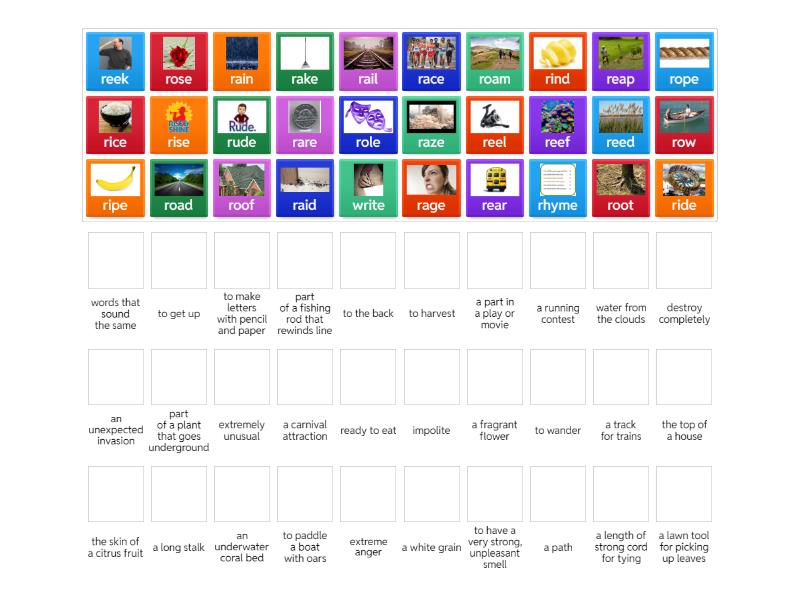raid - an unexpected invasion, rain - water from the clouds, race - a running contest, rage - extreme anger, rake - a lawn tool for picking up leaves, rail - a track for trains, rare - extremely unusual, raze - destroy completely, reed - a long stalk, reef - an underwater coral bed, reek - to have a very strong, unpleasant smell, reel - part of a fishing rod that rewinds line, reap - to harvest, rear - to the back, ride - a carnival attraction, rhyme - words that sound the same, rind - the skin of a citrus fruit, ripe - ready to eat, rise - to get up, write - to make letters with pencil and paper, rice - a white grain, road - a path, role - a part in a play or movie , roam - to wander, rope - a length of strong cord for tying, rose - a fragrant flower, row - to paddle a boat with oars, rude - impolite, roof - the top of a house, root - part of a plant that goes underground ,