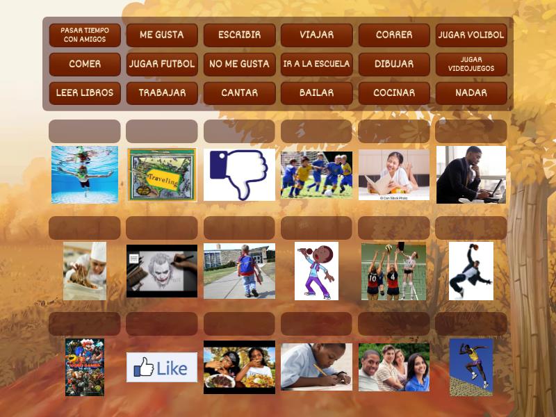 ME GUSTA, NO ME GUSTA, BAILAR, CANTAR, COMER, PASAR TIEMPO CON AMIGOS, IR A LA ESCUELA, COCINAR, CORRER, JUGAR VIDEOJUEGOS, ESCRIBIR , LEER LIBROS, NADAR, JUGAR FUTBOL, JUGAR VOLIBOL, DIBUJAR, TRABAJAR, VIAJAR,