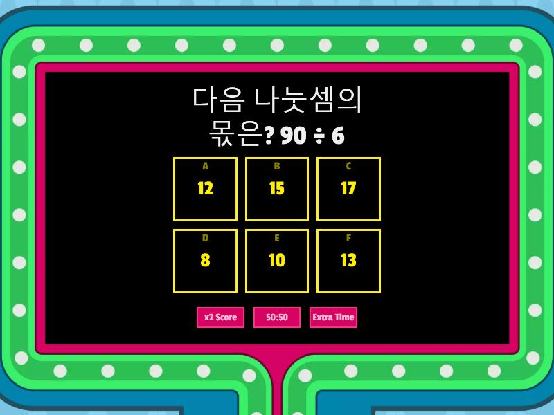 1) 다음 나눗셈의 몫은? 90 ÷ 6 a) 12 b) 15 c) 17 d) 8 e) 10 f) 13 2) 색종이 60장을 3명이 똑같이 나누어 가지면 한 명이 몇 장씩 가질 수 있을까? a) 10장 b) 30장 c) 15장 d) 5장 e) 20장 f) 40장 3) 클립 88개를 4모둠이 똑같이 나누어 쓰려면 한 모둠이 클립을 몇 개씩 쓸 수 있을까? a) 11개 b) 20개 c) 22개 d) 44개 e) 40개 f) 55개 4) 57÷3의 몫은? a) 12 b) 15 c) 17 d) 19 e) 21 f) 23 5) 23÷5=4 … 3 나눗셈 식에서 3을 23÷5의 ㅇㅇㅇ이라고 합니다. 빈칸에 들어갈 말은? a) 몫 b) 나머지 c) 나누는 수 d) 나누어지는 수 e) 수모형 f) 나누어 떨어진다 6) 나머지가 가장 큰 것을 찾으시오. a) b) c) d) e) f) 7) 다음을 계산해 보시오. 57 ÷ 4 =  a) 11…3 b) 11…2 c) 11…1 d) 14…3 e) 14…2 f) 14 …1 8) 600÷3를 계산해 보시오. a) 200 b) 300 c) 400 d) 500 e) 100 f) 50 9) 다음을 계산해 보시오. 840÷6 a) 120 b) 130 c) 140 d) 150 e) 160 f) 170 10) 나머지가 2인 것을 찾아 O표 하세요. a) b) c) d) e) f)