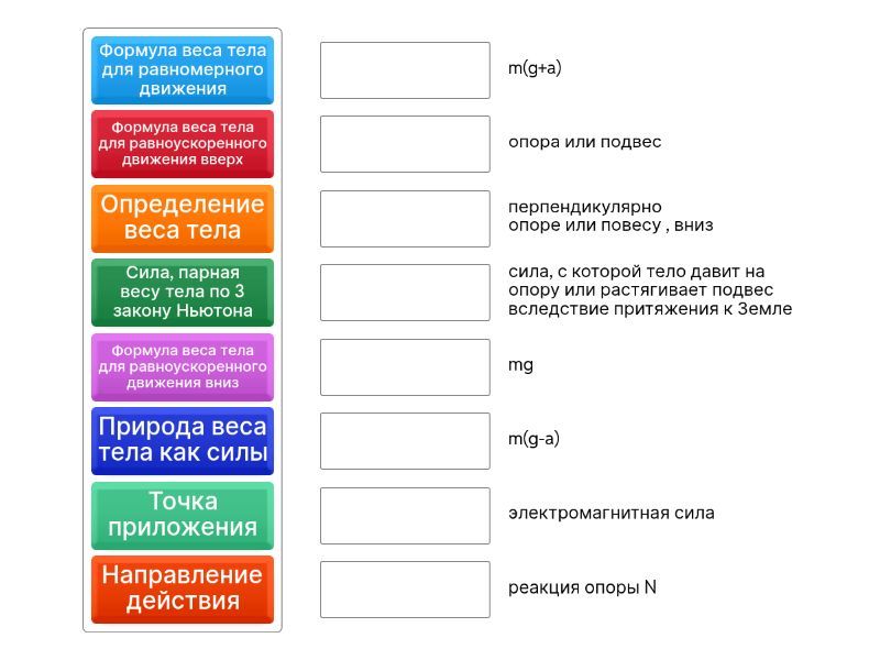 Определение веса тела - сила, с которой тело давит на опору или растягивает подвес вследствие притяжения к Земле, Природа веса тела как силы - электромагнитная сила, Формула веса тела для равномерного движения - mg, Формула веса тела для равноускоренного движения вверх  - m(g+a), Формула веса тела для равноускоренного движения вниз  - m(g-a), Сила, парная весу тела по 3 закону Ньютона - реакция опоры N, Направление действия - перпендикулярно опоре или повесу , вниз, Точка приложения - опора или подвес,