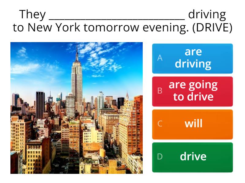 1) They __________________________ driving to New York tomorrow evening. (DRIVE) a) are driving b) are going to drive c) will d) drive 2) I hope the weather __________________________ nice when you get to Sardinia. (BE) a) is b) is being c) is going to be d) will be 3) We __________________________ married on June 25th. (GET) a) will get b) are getting c) are going to get d) get 4) I suppose real estate prices __________________________ up again next year. (GO) a) will go b) are going to c) go d) are going 5) I __________________________ football this afternoon so I can't make it to the party. (PLAY) a) am playing b) will play c) am going to play d) play 6) Put your wallet away. I __________________________ for the tickets. (PAY) a) am going to pay b) am paying c) will pay d) pay 7) I _____________________________ John at the airport tomorrow at 5.30. (MEET) a) am meeting b) meet c) will meet d) am going to meet 8) Take the umbrella with you. I think it __________________________ in the afternoon. (RAIN) a) will rain b) rain c) is going to rain d) is raining 9) I think I __________________________ a cup of tea after all. (HAVE) a) have b) am having c) am going to have d) will have 10) Which car __________________________ to buy? (YOU PLAN) a) do you plan b) are you planning c) are you going to plan 11) Jack missed the train. He __________________________ late again. (BE) a) is b) will be c) is going to be d) is being 12) All our stores __________________________ next Monday at 10.00 a.m (OPEN) a) open b) are opening c) will open d) are going to be open  13) He looks very pale and confused. He __________________________ (FAINT) a) faint b) will faint c) is going to faint d) is fainting 14) This movie __________________________ at 6.30 pm (START) a) starts b) is starting c) will start d) is going to start