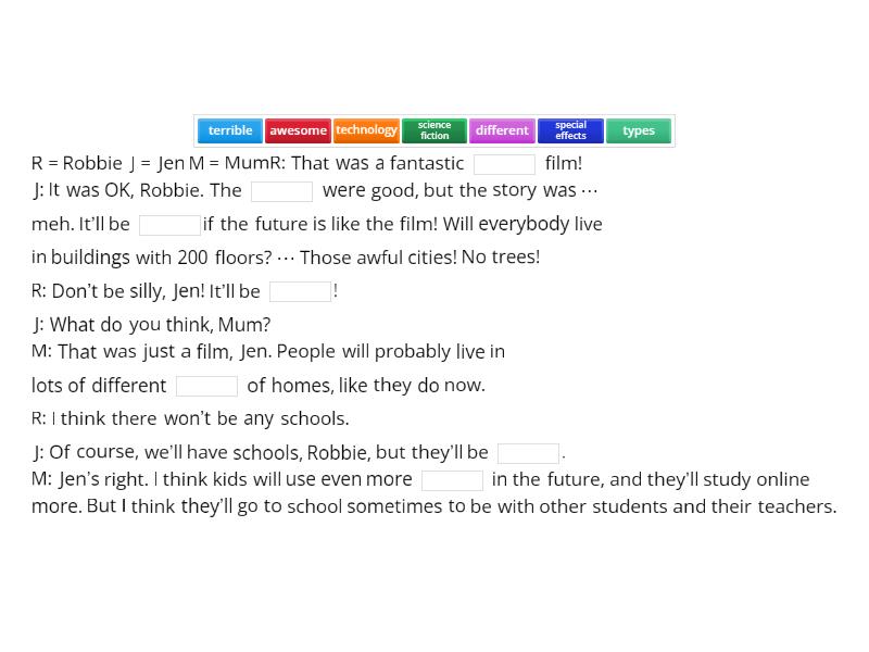 R = Robbie J = Jen M = MumR: That was a fantastic ____ film! J: It was OK, Robbie. The ____ were good, but the story was … meh. It’ll be ____if the future is like the film! Will everybody live in buildings with 200 floors? … Those awful cities! No trees! R: Don’t be silly, Jen! It’ll be ____! J: What do you think, Mum? M: That was just a film, Jen. People will probably live in lots of different ____ of homes, like they do now. R: I think there won’t be any schools. J: Of course, we’ll have schools, Robbie, but they’ll be ____. M: Jen’s right. I think kids will use even more ____ in the future, and they’ll study online more. But I think they’ll go to school sometimes to be with other students and their teachers. R: I hope there won’t be exams … What about work, Mum?M: What do you think, Robbie? R: I think we’ll have different jobs. More people shop online, so there won’t be ____ … Maybe everybody will work from ____. J: Or maybe robots will do all the ____ jobs … M: Well, I’m sure people will do a lot of the same things we do now. They’ll ____ with their friends, and they’ll have hobbies and make things and sing and play music