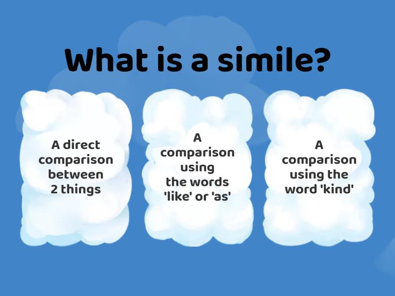 1) What is a simile? a) A direct comparison between 2 things b) A comparison using the words 'like' or 'as' c) A comparison using the word 'kind' 2) What is a metaphor? a) A comparison using the word 'kind' b) A comparison using the words 'like' or 'as' c) A direct comparison between two things 3) It is raining cats and dogs is an example of? a) A metaphor b) A simile c) A smile d) An idiom 4) 'It is raining cats an dogs' suggests that... a) There are animals falling from the sky b) The rain is loud c) The weather is fine d) Cats and dogs are crying e) It is raining hard 5) If we say the girl is like a mouse- what are we saying is similar? a) her size b) how furry she is c) how loud she is d) how quiet she is e) how quickly she scuttles 6) Which of the following is a simile? a) The monstrous baby b) The green forest c) The boy is as quick as a jackal d) The boy is a angel 7) Which of the following is a metaphor? a) The daughter is the devil b) The sad mother c) The mum is as skinny as a bean pole d) The daughter is scared 8) Which of the following is the correct spelling? a) similie b) simile c) smile d) smilie 9) which is the correct spelling for the following ? a) metapor b) metaphore c) metipor d) metaphor e) metipore 10) Which of the following is not a simile or a metaphor? a) He is a lion b) She is like a eagle c) It is as heavy as a brick d) He is tall e) She is eagle eyed f) She is as white as a ghost