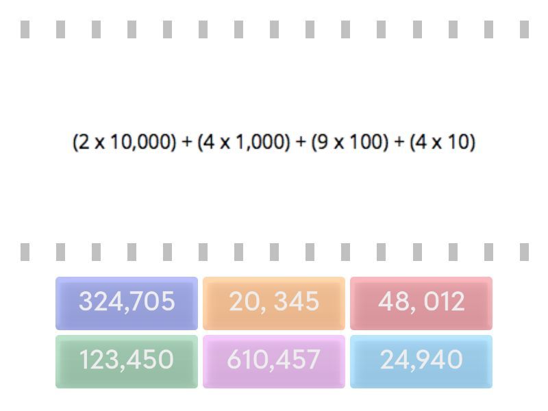 24,940, 48, 012 , 20, 345, 123,450 - (1 x 100,000) + (2 x 10,000) + (3 x 1,000) + (4 x 100) + (5 x 10), 610,457 - (6 x 100,000) + (1 x 10,000) + (4 x 100) + (5 x 10) + (7 x 1), 324,705 - (3 x 100,000) + (2 x 10,000) + (4 x 1,000) + (7 x 100) + (5 x 1),