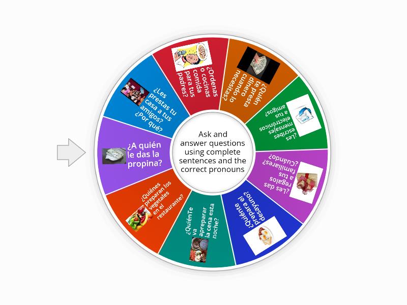 ¿Les prestas tu casa a tus amigos? ¿Por qué?, ¿Ordenas o cocinas comida para tus padres?, ¿Quién te presta dinero cuando lo necesitas?, ¿Les escribes mensajes electrónicos a tus amigos?, ¿Les das regalos a tus familiares? ¿Cuándo?, ¿Quiénte prepara el desayuno?, ¿QuiénTe va apreparar la cena esta noche? , ¿Quiénes preparan los vegetales en el restaurante?, ¿A quién le das la propina?.