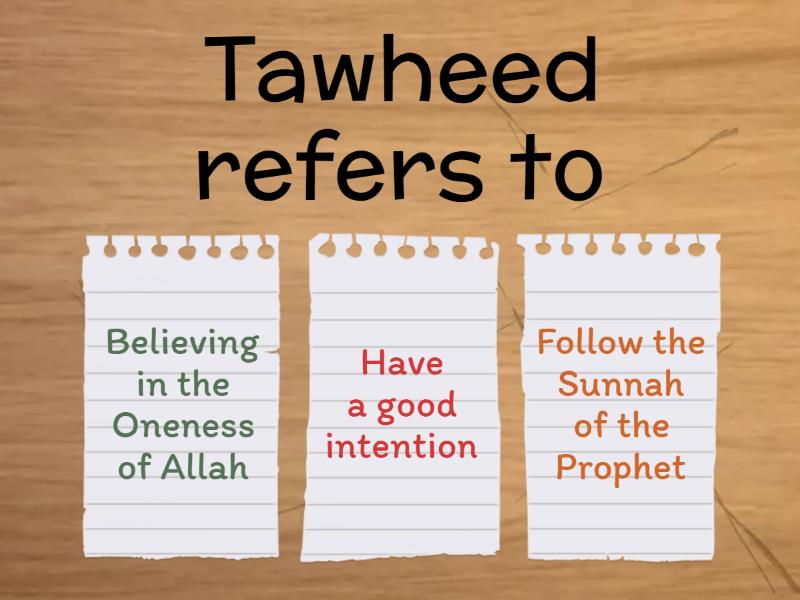 1) Tawheed refers to a) Believing in the Oneness of Allah b) Have a good intention c) Follow the Sunnah of the Prophet 2) Hadith is the a) Prophet's family and companions b) Prophet's saying and actions c) Prophet's wives and mothers 3) What is the first month of Islamic calendar? a) Rajab b) Ramadan c) Muharram d) Dhul-Hijja 4) Does Allah (SWT) need our worship? a) Yes b) No c) Sometimes 5) How many ayahs in Suratul-Iklas a) 3 b) 4 c) 5 d) 6 6) Ayatul- Kursi is the a) Fullest ayah in Quran of Allah's names b) Longest Ayah in the Quran c) Heaviest Ayah in the Quran as it carries a lot of islamic rules d) greatest ayah in the Quran 7) The rewards of the reciter of ayatul- Kursi before sleeping is a) erasing of the sins of that day b) protected from Shiytan through the night c) Receiving Allah's mercy and blessings 8) The first pillar of Islam is a) Believing in Allah b) Shahadah c) Salah d) Believing in the unseen 9) This is NOT from the pillars of Iman a) Give Zakat b) Believe in the angels c) Believe in the decree; good or bad d) Believe in all the Books 10) Maintaining the Unity of Allah in Lordship is called a) Tawheed Ar-Ruboobiyah b) Tawheed Al-Uloohiyah c) Tawheed Asmaa' W-Sifaat 11) According to the 2nd hadith of An-Nawawi there are 3 levels of deen and the third is named...... a) Islam b) Iman c) Ihsan 12) The person who believes in Tawheed Ar-Ruboobiyah and doesn't believes in Tawheed Al-Uluohiya is considered a Muslim a) True b) False 13) As-Samad is one of Allah's names and it means a) The Ever-Living b) The Self Sustainer that is free from any needs and all creations need Him c) The Most High d) The Great 14) Believing that prayer and Dua' should be only directed to Allah is a) Tawheed Ar-Ruboobiyah b) Tawheed Al-Uloohiyah c) Tawheed Asmaa' W-Sifat 15) Ayatul-Kursi has ----- of Names of Allah a) 4 b) 5 c) 6 16) In order the Prophet came to teaches us a) Aqeeda(Tawheed) - Ibada(Worship) - Akhlaaq(Manners) b) Ibada - Aqeeda - Akhlaaq c) Akhlaaq- Aqeeda - Ibadah