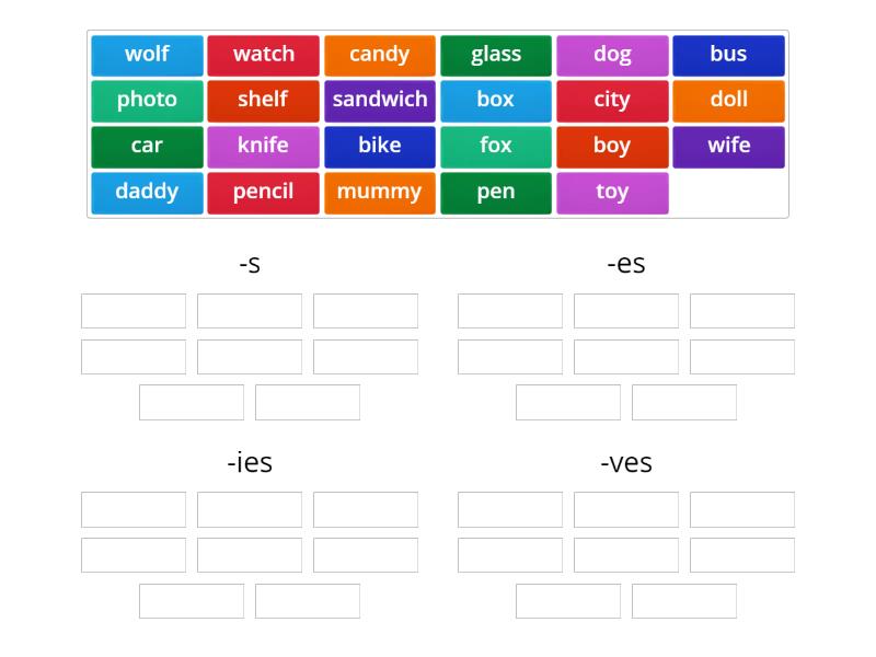 -s: dog, bike, car, doll, pen, pencil, boy, toy, -es: bus, glass, watch, box, sandwich, fox, photo, -ies: candy, daddy, city, mummy, -ves: wolf, knife, wife, shelf,