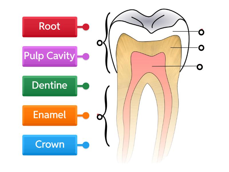 Crown, Root, Enamel, Dentine, Pulp Cavity.