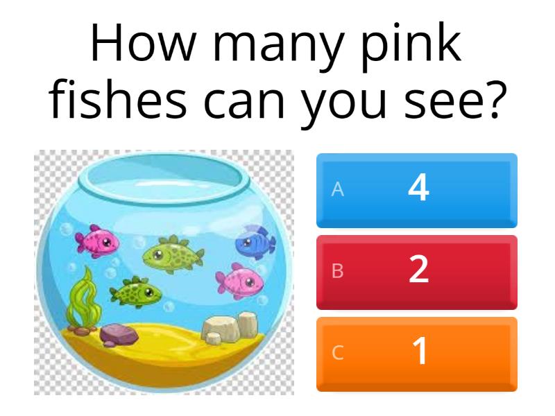 1) How many pink fishes can you see? a) 4 b) 2 c) 1 2) How many green fishes can you see? a) 2 b) 5 c) 3 3) How many blue fishes can you see? a) 1 b) 3 c) 2 4) How many red spoons can you see? a) 5 b) 2 c) 3 5) How many blue spoons can you see? a) 3 b) 1 c) 0 6) How many yellow spoons can you see? a) 3 b) 4 c) 1 7) How many yellow balloons? a) 4 b) 2 c) 3 8) How many red balloons? a) 2 b) 3 c) 5 9) How many blue balloons? a) 6 b) 4 c) 2 10) Which colour balloon is maximum in number? a) blue b) red c) yellow