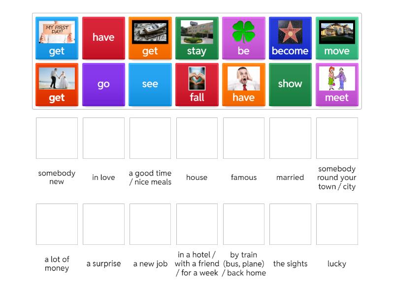 become - famous, get - a new job, get  - married, meet - somebody new, fall - in love, get - a lot of money, have - a surprise, be - lucky, move  - house, stay - in a hotel / with a friend / for a week, show - somebody round your town / city, see - the sights, go - by train (bus, plane) / back home, have - a good time / nice meals,