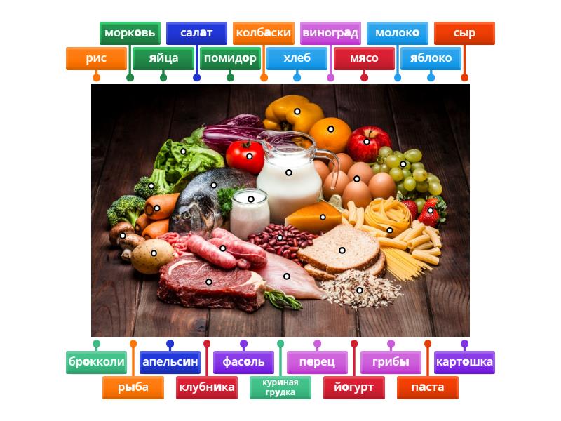 молоко, йогурт, рыба, помидор, перец, салат, брокколи, сыр, фасоль, яблоко, мясо, рис, яйца, виноград, апельсин, куриная грудка, паста, картошка, хлеб, клубника, колбаски, морковь, грибы.