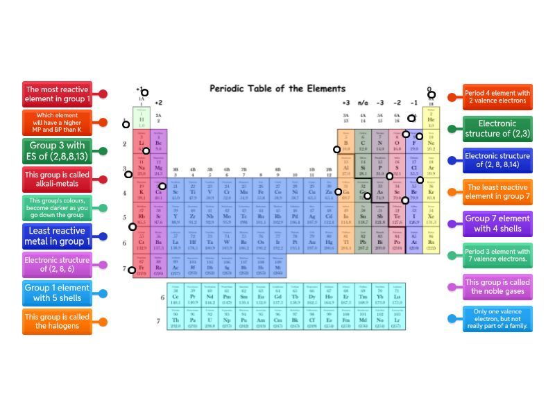 Only one valence electron, but not really part of a family., This group is called alkali-metals, This group is called the halogens, Group 3 with ES of (2,8,8,13), This group is called the noble gases, Least reactive metal in group 1, Period 3 element with 7 valence electrons., Period 4 element with 2 valence electrons, Group 7 element with 4 shells , Group 1 element with 5 shells, The most reactive element in group 1, The least reactive element in group 7, Electronic structure of (2,3), Electronic structure of (2, 8, 6) , Electronic structure of (2, 8, 8,14), This group's colours, become darker as you go down the group, Which element will have a higher MP and BP than K.