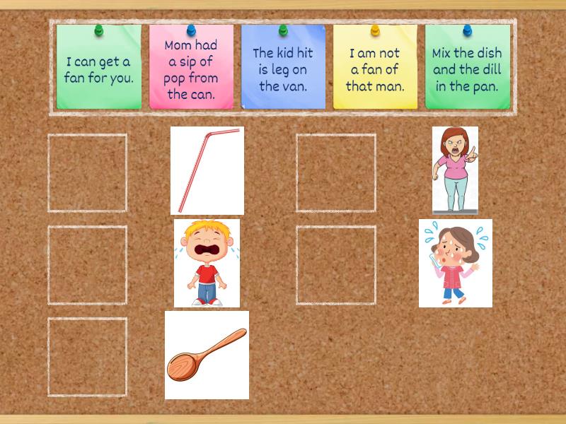 Mix the dish and the dill in the pan., I can get a fan for you., I am not a fan of that man., Mom had a sip of pop from the can., The kid hit is leg on the van.,