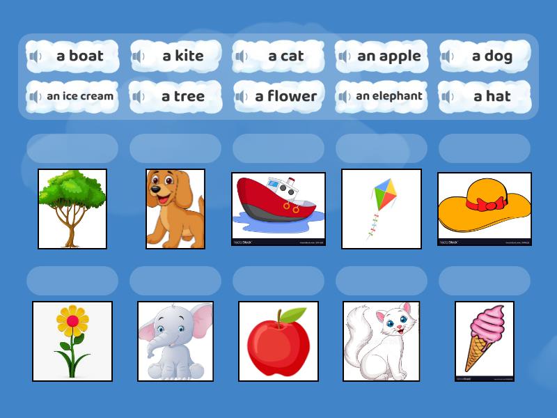 a cat, a boat, an apple, a dog, an elephant, a kite, an ice cream, a tree, a hat , a flower,