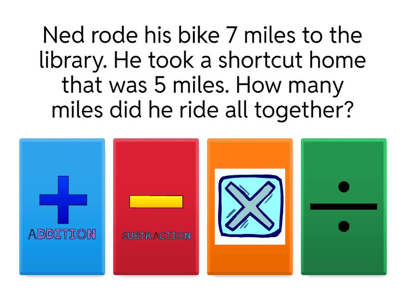 1) Ned rode his bike 7 miles to the library. He took a shortcut home that was 5 miles. How many miles did he ride all together? a) b) c) d) 2) Richard has $6.00. Scott has $8.00 more than Richard. How much money does Scott have? a) b) c) d) 3) A total of 32 students are going to the zoom. There are going to be 4 groups, how many students in each group? a) b) c) d) 4) The science museum is 16 miles away. Danny and his family have already driven 7 miles. How many more miles do they have left to drive? a) b) c) d) 5) Doug has 3 times as many baseball cards as Kevin. Kevin has 10 baseball cards. How many does Doug have? a) b) c) d) 6) At Logan's party, there were 4 pizzas. Each pizza had 8 slices. How many slices of pizza were there total? a) b) c) d) 7) Jon caught 16 fireflies at night. James caught 12 fireflies. How many did they catch in total? a) b) c) d) 8) The lost and found bin had 50 jackets on Monday. On Tuesday 16 students picked up their jackets from the bin. How many jackets were left? a) b) c) d) 9) Pam has 11 video games. Sue has 3 fewer than Pam. How many video games does Sue have? a) b) c) d) 10) The store sold cupcakes in packs of 12. How many cupcakes did I buy if I bought 2 packs? a) b) c) d)