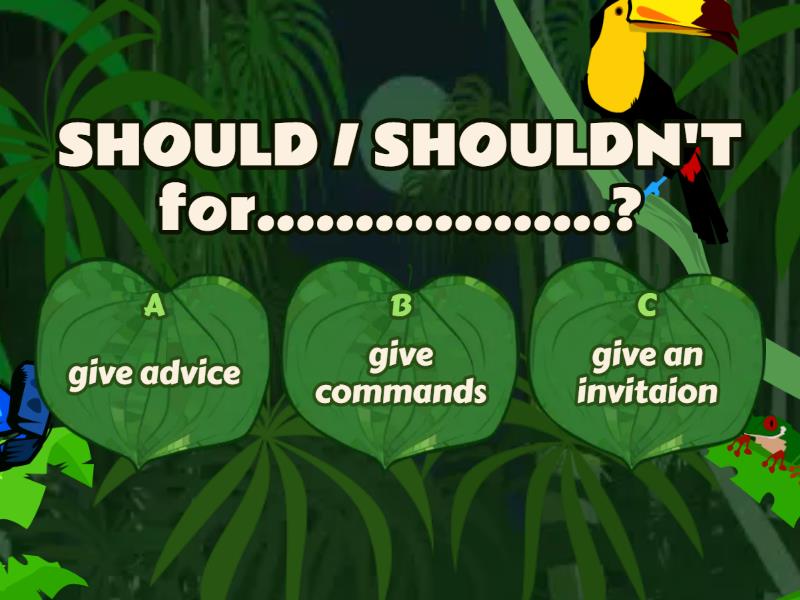 1) SHOULD / SHOULDN'T for..................? a) give advice b) give commands c) give an invitaion 2) Which sentence has correct form? a) We should say " Thank you"  b) We should saying " Thank you" c) We should to say " Thank you" 3) You _______ bring a warm coat. It's very cold a) should b) shouldn't 4) SOME is used in...............? a) negative sentences b) positive , offering and asking for something c) questions sentences 5) ANY is used in .............................? a) negative and questions sentences b) positive sentences c) offering and asking for something  6) There are...................traditional games . a) any b) some 7) Would you like...........................fruit? a) any b) some 8) You _______ eat fruits and vegetables. It is good for your health. a) should b) shouldn't 9) There is _______ milk in the fridge. a) some b) any 10) There are _____ pens a) any b) some 11) Children ______ use phone too much. a) should b) shouldn't 12) There isn't ____ money in my pockets. a) any   b) some 13) You should _______ a) make a wish  b) making a wish c) to make a wish 14) You ______________read books every day. a) shouldn't  b) should