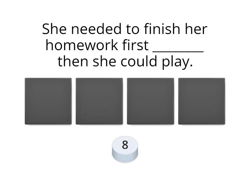 1) She needed to finish her homework first ________ then she could play. a) , b) , and c) , Then d) ,but 2) They did not win the prize _______ they were happy. a) , They b) , and c) , d) , but 3) It was hot outside ________ he went swimming. a) , so b) , c) , but d) , He 4) You can choose to be happy _______ you can choose to be sad. You can't be both. a) , b) , and c) , or d) , You