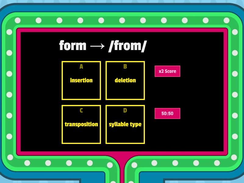1) form → /from/ a) insertion b) deletion c) transposition d) syllable type 2) p → q a) sight word b) reversal c) insertion d) inversion 3) gum → glum  a) insertion b) reversal c) deletion d) syllable type 4) lĕm on → lē mon a) transposition b) substitution c) reversal d) syllable division 5) strapped → stripped a) addition b) deletion c) substitution d) transversal 6) brake → bake a) rule-based error b) deletion c) addition d) inversion 7) gobbles → gobles a) syllable pattern/division b) deletion c) reversal d) sight word error 8) pig → big a) insertion b) substitution c) omission d) transposition