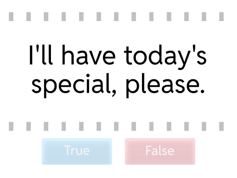 True: I'll have today's special, please., The sky is so dark, it's gonna rain., I'm playing tennis with Mary tomorrow., There's someone at the door, I'll check it., We're having dinner on Saturday., False: I'm going to be 50 in 2030., It's gonna rain, I think., My friends gonna come over tonight.,