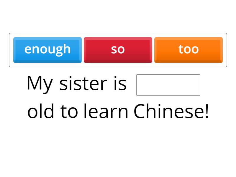 My sister is ____ old to learn Chinese! This glass isn't big ____ to pour the water. This coat isn't warm ____. I need to buy a new one. The books were ____ heavy for me to carry. The coffee was ____ cold, I couldn't drink it. The film was ____ boring that we left halfway through. She is ____ thin to wear that dress. My cat was running ____ fast that the dogs couldn't catch it. Maria was ____ tired to do the homework last night. This new chair isn't comfortable ____ for me. I am ____ tired, I can't do my homework. That comedy was ____ funny we couldn't stop laughing! I've got ____ many books ____ I need a new shelf to organise them. Mike was ____ good student that he got a scholarship.