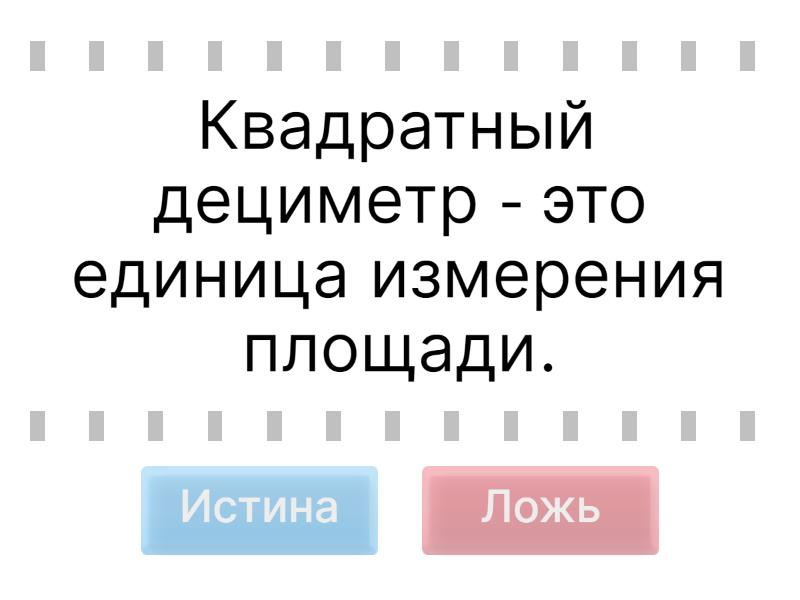 Истина: Квадратный дециметр - это единица измерения площади. , Словами квадратный дециметр при числах записывают так: 6 дм 2 . , 1 дм 2 = 100 см 2, 100 см 2 = 1 дм 2 , Ложь: Квадратный дециметр - это единица измерения периметра. , Словами квадратный дециметр при числах записывают так: 6 дм 2 ., 1 дм 2 = 100 см 2, 100 см 2 = 1 дм 2 ,