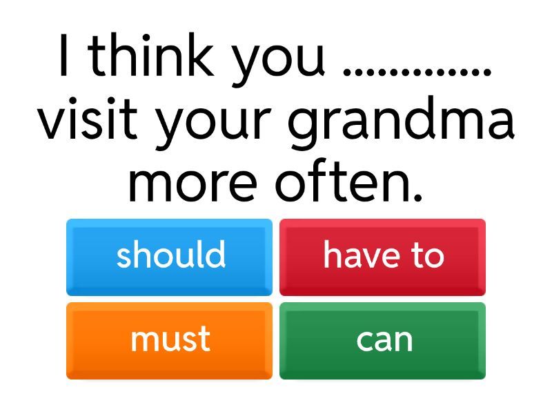 1) I think you ............. visit your grandma more often. a) should b) have to c) must d) can 2) Look at the sign! You ............. take photos in the gallery. a) mustn't b) shouln't c) needn't d) don't have to 3) All right, we are finished. You .......... have a break now. a) must b) can c) have to d) not have to 4) I ............. study hard if I want to pass the exam. (Internal feeling) a) can't b) can c) have to d) must 5) I ............ finish this task today. It's in the contract. a) must b) have to c) can d) has 6) ........... I take this handbag into the museum? Is it allowed? a) can b) should c) must d) do have to 7) You .................. buy her that Britney CD. It's not a good idea. a) mustn't b) can't c) shouldn't d) don't have to. 8) It's .... download films from the Internet. You can get in trouble for that. a) shouldn't b) prohibited c) prohibited to d) mustn't 9) You .............. smoke in the hospital. a) mustn't b) don't have to c) have to d) can't 10) I've already phoned Jane, you ........... do it again. a) must b) can't c) mustn't d) don't have to 11) He's going to go deaf. He ............ listen to Spotify so loud! a) mustn't b) needn't c) can't d) shouldn't 12) You .............. speak rudely to your teachers. a) not have to b) mustn't c) needn't d) don't have to 13) You ............. get a new pen.You can use mine. a) don't need to b) needn't to c) mustn't d) can't 14) You ................ bring a sandwich, because we didn't order lunch. a) need b) need to c) can d) don't have to 15) It's ... to own exotic animals. It's prohibited. a) against the law b) ought c) necessary d) nice 16) It's OK, you ............ take a day off tomorrow. a) can b) have to c) must d) should 17) You ............. tell Adam about the party. It's a surprise. a) mustn't to b) needn't c) can't d) mustn't 18) You look tired. I suppose you ............. take a break. a) should b) must c) have to d) don't have to 19) You ....... to stay at the party longer than 10 p.m. You have to go home now or your parents will be very angry. a) are allowed b) have c) aren't allowed d) should 20) You .... use that vending machine. It's out of order. a) are allowed to b) should c) must d) can't 21) You .... learn grammar. It's necessary to learn any language. a) have to b) ought c) mustn't d) need 22) If I were you, I ..... dive here. This lake is very deep. a) can b) should c) wouldn't d) would 23) I don't think you ..... drink any more of this cola. You're going to get sick. a) can b) must c) have to d) should 24) Smoking in the museum is .... . You mustn't do that here. a) allowed b) forbidden c) cool d) great 25) You ............. eat so many sweets. It's not healthy. a) couldn't b) don't have to c) shouldn't d) might