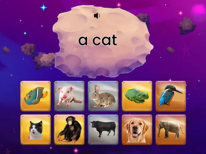 a cat, a pig, a dog, a frog, an ox, an elephant, a monkey, a rabbit, a bird, a fish,