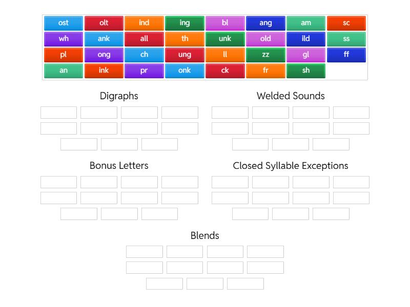 Digraphs: sh, th, ch, wh, ck, Welded Sounds: ank, ink, onk, unk, ang, ing, ong, ung, all , am, an, Bonus Letters: ff, ll, ss, zz, Closed Syllable Exceptions: ind, ild, old, olt, ost, Blends: pl, fr, sc, bl, pr, gl,