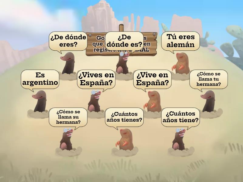 Correcto: ¿De dónde eres?, Tú eres alemán, ¿Vives en España?, ¿Cómo se llama tu hermana?, ¿Cuántos años tienes?, ¿Cómo te llamas?, ¿Tienes hermanos?, tú , Incorrecto: ¿De dónde es?, Es argentino, ¿Vive en España?, ¿Cómo se llama su hermana?, ¿Cuántos años tiene?, ¿Cómo se llama?, ¿Tiene hermanos?, usted,