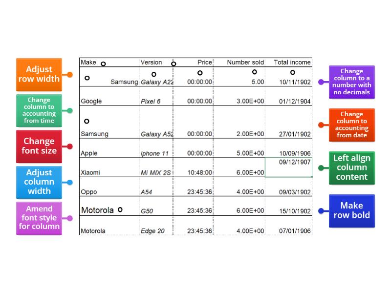 Adjust column width, Change font size , Adjust row width , Left align column content, Amend font style for column, Make row bold, Change column to accounting from time, Change column to accounting from date, Change column to a number with no decimals.