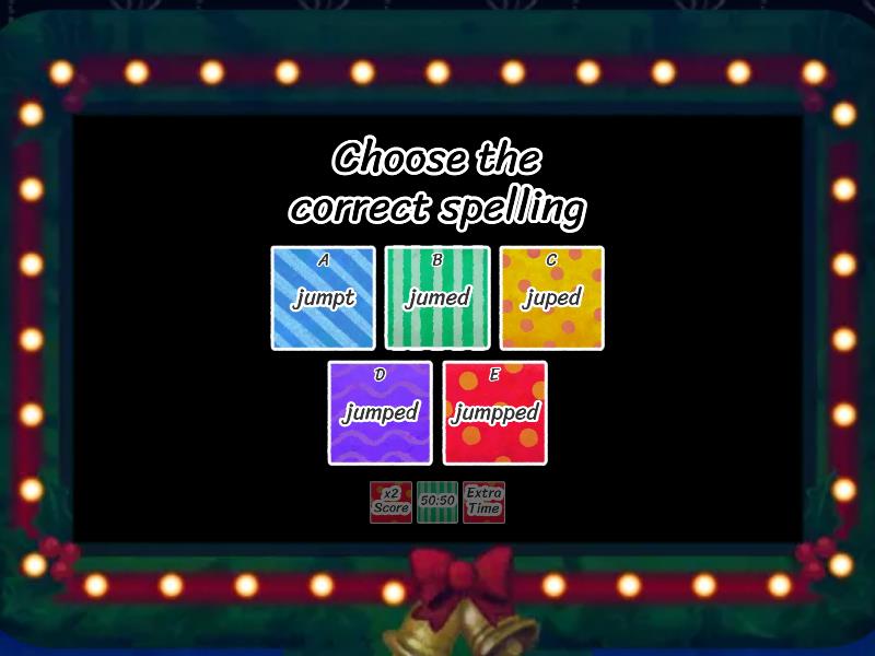 1) Choose the correct spelling a) jumpt b) jumed c) juped d) jumped e) jumpped 2) Choose the correct spelling a) caled b) called c) calld d) callled e) calde 3) Choose the correct spelling a) tapped b) tapt c) taped d) tappde e) tappped 4) Choose the correct spelling a) listid b) listed c) listted d) lissted e) listde 5) Choose the correct spelling a) mendded b) mendid c) mended d) mendded e) mennded 6) Choose the correct spelling a) skimed b) skimmed c) skimmde d) scimmed e) skimmd 7) Choose the correct spelling a) liffted b) liftted c) liftid d) lifted e) liftid 8) Choose the correct spelling a) slipt b) sliped c) slipped d) slippt e) slipde
