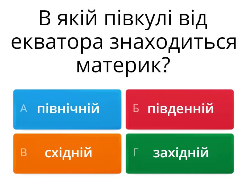 1) В якій півкулі від екватора знаходиться материк? a) північній b) південній c) східній d) західній 2) Як називається гірська система в східній частині материка? a) Кордильєри b) Гімалаї c) Великий Вододільний хребет d) Альпи 3) Виберіть тварину ендемік, яка мешкає на території Австралії. a) верблюд b) качкодзьоб c) білий ведмідь d) леопард