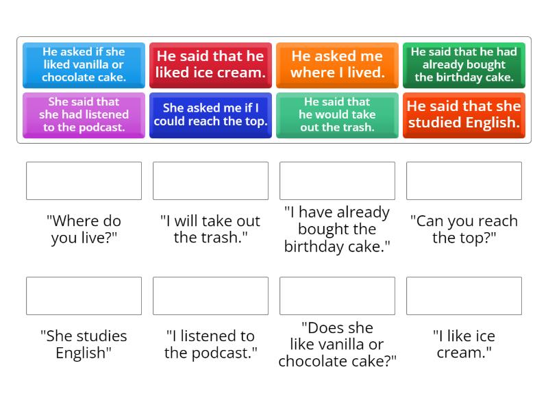 He said that he liked ice cream. - "I like ice cream." , She said that she had listened to the podcast. - "I listened to the podcast." , He said that he would take out the trash. - "I will take out the trash." , He said that he had already bought the birthday cake. - "I have already bought the birthday cake." , He asked if she liked vanilla or chocolate cake. - "Does she like vanilla or chocolate cake?" , He asked me where I lived. - "Where do you live?" , He said that she studied English.  - "She studies English" , She asked me if I could reach the top.  - "Can you reach the top?" ,
