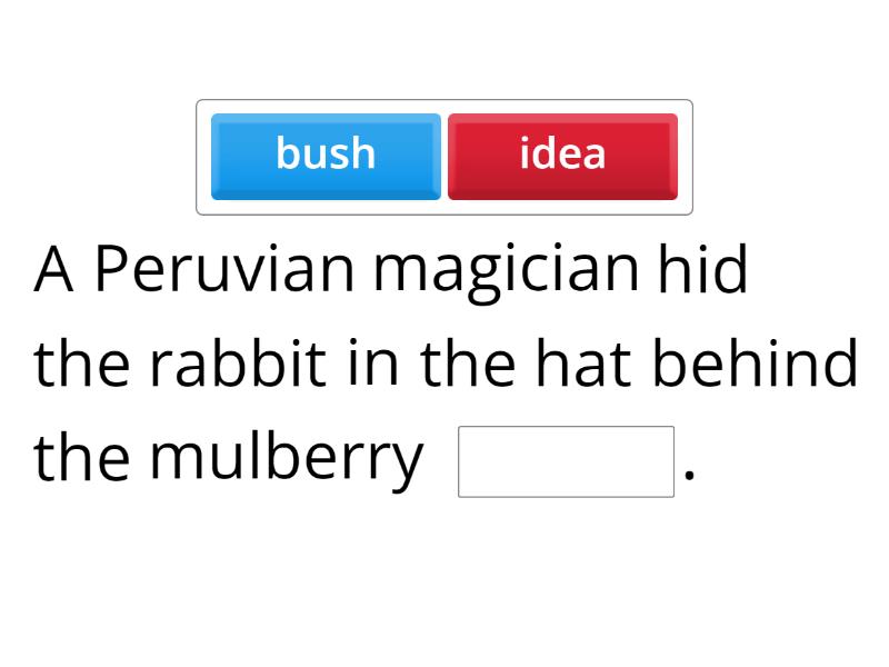 A Peruvian magician hid the rabbit in the hat behind the mulberry ____. The beautician picked up her ____ and said, "Let's go over to the ____ to cut your hair." Maria and Alexandria dined at the Peruvian ____ last Wednesday. Lydia's brother lifted her spirits by making her favorite Italian ____ when she came home from the hospital. The buzzing fly was a terrible ____ during Gloria's concert, I hope the governor from the Philadelphia ____ will follow through on his ____ to improve our economy. Virginia was so hungry that she ate all the rest of the ____ in the pantry.