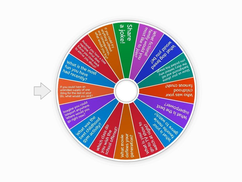What is the most fun you have had recently?, Pretend you have a time machine. What does future you come back to advise you about?, If you could try anything without any consequences, what would you try?, Share a joke!, What fictional family would you most like to join?, What dog breed would you be?, Show us your phone background and tell the story behind why you picked this image., Who was your childhood famous crush?, What is the best superpower?, What is your favorite movie genre to watch?, What is your go-to TV show to watch at night?, What movie defines your generation?, Which class do you wish the school offered?, What was the best childhood gym activity?, Imagine you could teleport anywhere. Where would you go right now?, If you could have an unlimited supply of one thing for the rest of your life, what would you pick?.