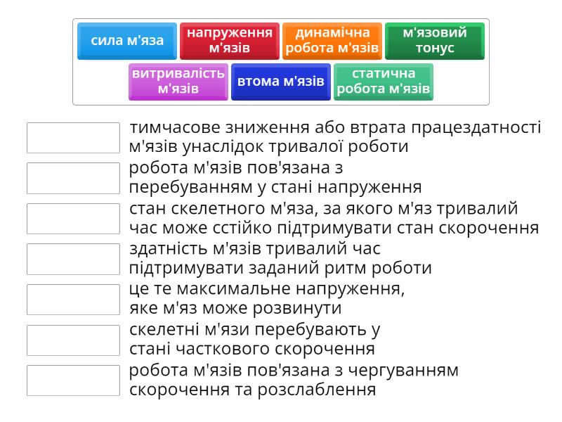 напруження м'язів - стан скелетного м'яза, за якого м'яз тривалий час може сстійко підтримувати стан скорочення , сила м'яза - це те максимальне напруження, яке м'яз може розвинути, статична робота м'язів - робота м'язів пов'язана з перебуванням у стані напруження, динамічна робота м'язів - робота м'язів пов'язана з чергуванням скорочення та розслаблення, м'язовий тонус - скелетні м'язи перебувають у стані часткового скорочення, витривалість м'язів - здатність м'язів тривалий час підтримувати заданий ритм роботи, втома м'язів - тимчасове зниження або втрата працездатності м'язів унаслідок тривалої роботи,