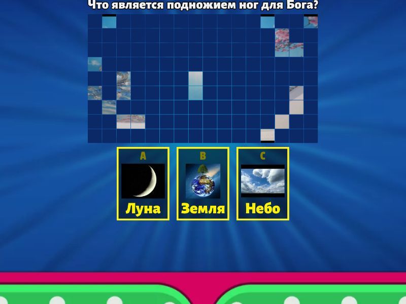 1) Что является подножием ног для Бога? a) Луна b) Земля c) Небо 2) В каком городе Иегова дал людям разные языки? a) Иерусалим b) Самария c) Вавилон 3) Сколько человек спаслось во времени Всемирного потопа? a) Шесть b) Один человек Ной c) Восемь 4) Как Библия помогает в повседневной жизни? a) Даёт практические советы b) Имеет магическую силу c) Никак 5) Для чего Бог создал землю? a) Испытать людей в трудностях b) Чтобы на ней жили люди вечно c) Отобрать лучших на небо 6) Что сказал отец Даниилу, когда подарил ему подарок? a) Пусть слова Иеговы будут всегда с тобой b) Никогда не забывай отцовское наставление c) Будь всегда успешен на своём пути 7) Сколько времени было дано Даниилу и его семьи, чтобы попрощатьс a) 30 минут b) 1 минуты c) 5 минут 8) Изображение какого животного рассматривал Даниил в одной из комнат во дворце? a) Тигр b) Лев c) Верблюд 9) Кем назначил Царь Даниила после толкования сна? a) Правителем над всей правинцией Вавилона b) Телохранителем царь c) Военоначальником 10) Что было в свитке, подаренном Даниилу a) Чертёж храма b) Напутствие отца c) Псалом 11) Как ты думаешь, откуда в атмосферу поступает 70% кислорода? a) Из лесов b) Из океанов c) Из гор 12) Что способен накапливать лес? a) Водород b) Кислород c) Углерод 13) Насколько поверхность нашей земли покрыта океанами? a) 85% b) 71% c) 65% d) 10% 14) Сколько городов в России? a) 2135 b) 1117 c) 988