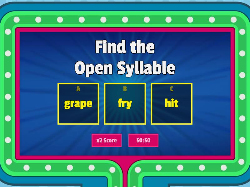 1) Find the Open Syllable a) pet b) date c) so 2) Find the Vowel Consonant E Syllable a) struck b) ride c) by 3) Find the Closed Syllable a) bone b) met c) be 4) Find the Closed Syllable a) ate b) fly c) shock 5) Find the Open Syllable a) grape b) fry c) hit 6) Find the Vowel Consonant E Syllable a) flute b) hi c) plant 7) Find the Closed Syllable a) frost b) skate c) fry 8) Find the Vowel Consonant E Syllable a) try b) blank c) white 9) Find the Open Syllable a) soft b) flu c) here 10) Find the Closed Syllable a) came b) lift c) why