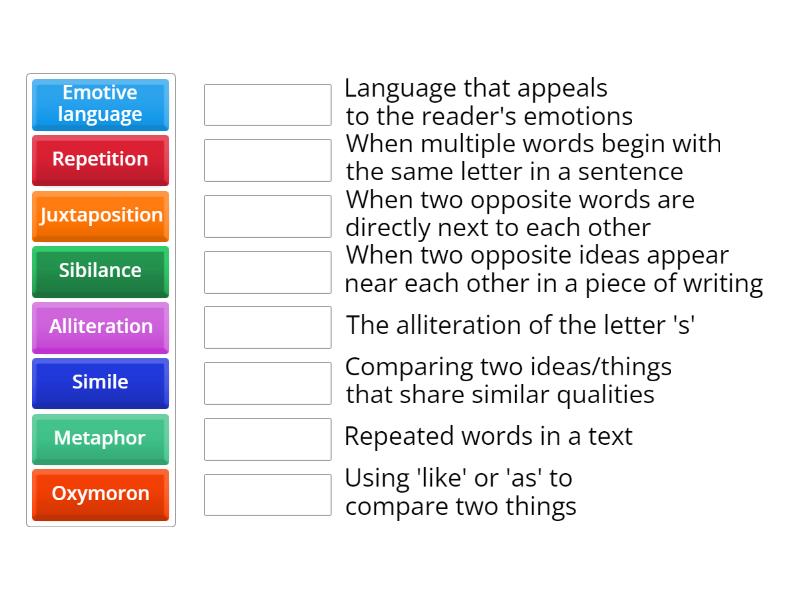 Juxtaposition - When two opposite ideas appear near each other in a piece of writing, Oxymoron - When two opposite words are directly next to each other , Alliteration - When multiple words begin with the same letter in a sentence, Metaphor - Comparing two ideas/things that share similar qualities, Simile - Using 'like' or 'as' to compare two things, Emotive language - Language that appeals to the reader's emotions, Sibilance - The alliteration of the letter 's' , Repetition - Repeated words in a text,