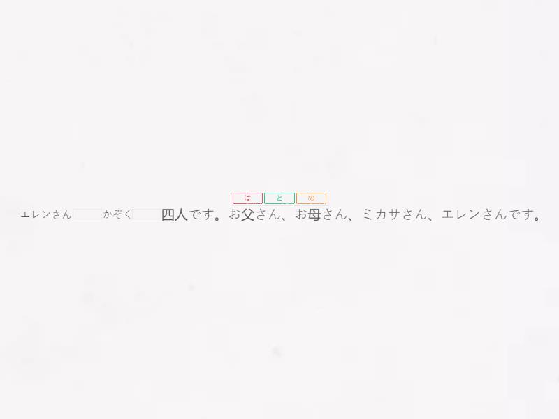 エレンさん____かぞく____四人です。お父さん、お母さん、ミカサさん、エレンさんです。 ミカサさん____エレンさんはきょうだいじゃありません____、いっしょにすんでいます。 エレンさんはおにいさん____いますが、いっしょに____。 エレンさんのおにいさんは大きいです。やきゅう____じょうずです。 エレンさんのまち____かべ____中____あります。 まち____人____たくさんいます。 かべのそと外____きょじんがいます____、まちの人はそとに____。 エレンさん____うちの下____お父さんのへや____あります。 へやにつくえがあります。お父さんはへや____本をかきました。 つくえの中に____あります。