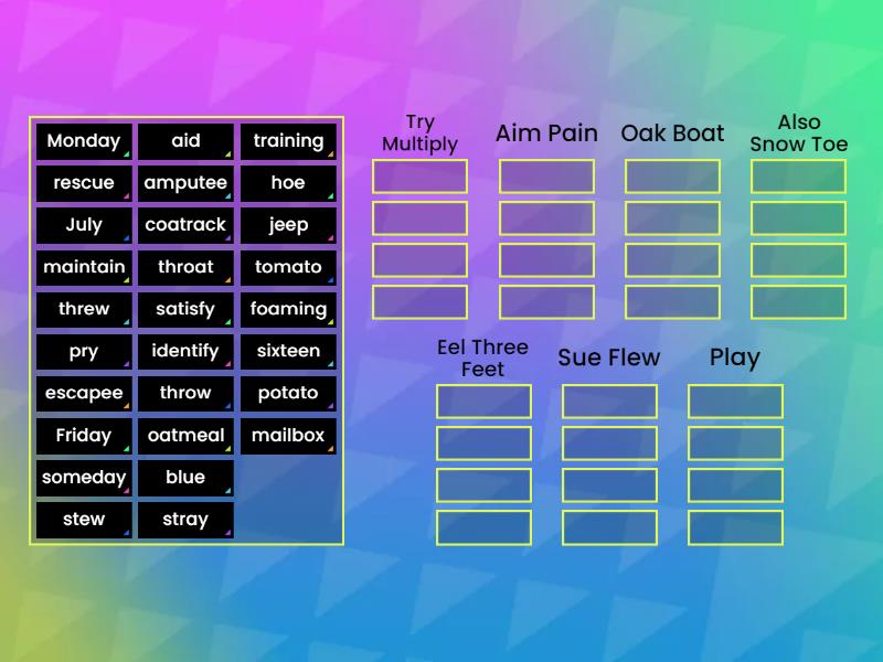 Try Multiply: July, satisfy, pry, identify, Aim Pain: mailbox, aid, maintain, training, Oak Boat: coatrack, oatmeal, throat, foaming, Also Snow Toe: hoe, throw, potato, tomato, Eel Three Feet: escapee, amputee, jeep, sixteen, Sue Flew: threw, blue, rescue, stew, Play: stray, someday, Friday, Monday,