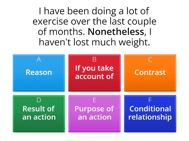 1) I have been doing a lot of exercise over the last couple of months. Nonetheless, I haven’t lost much weight. a) Reason b) If you take account of  c) Contrast d) Result of an action e) Purpose of an action f) Conditional relationship 2) Swimming is very good for all your joints. Conversely, football isn’t. Especially for the knees. a) Reason b) If you take account of c) Contrast d) Result of an action e) Purpose of an action f) Conditional relationship 3) They had a massive argument last night, hence that is why they are not talking today. a) Reason b) If you take account of c) Contrast d) Result of an action e) Purpose of an action f) Conditional relationship 4) The film, albeit a little long, was overall very enjoyable. a) Reason b) If you take account of c) Contrast d) Result of an action e) Purpose of an action f) Conditional relationship 5) Seeing that I didn’t have anything to do, I decided to clean my house. a) Reason b) If you take account of c) Contrast d) Result of an action e) Purpose of an action f) Conditional relationship 6) I am studying English as a means to get a better job in the future. a) Reason b) If you take account of c) Contrast d) Result of an action e) Purpose of an action f) Conditional relationship 7) Improving your knowledge of the topics you are likely to encounter in the reading exam will make them easier to understand, thereby making it easier to identify the right answers. a) Reason b) If you take account of c) Contrast d) Result of an action e) Purpose of an action f) Conditional relationship 8) I fell over on my way here, thus the mud on my clothes. a) Reason b) If you take account of c) Contrast d) Result of an action e) Purpose of an action f) Conditional relationship 9) She became a professional tennis player through hard work, determination and talent. a) Reason b) If you take account of c) Contrast d) Result of an action e) Purpose of an action f) Conditional relationship 10) Given that he only started training for the event last month, his time for the marathon is very impressive. a) Reason b) If you take account of c) Contrast d) Result of an action e) Purpose of an action f) Conditional relationship 11) You will still be able to come to the party on the proviso that you behave yourself whilst you are there. a) Reason b) If you take account of c) Contrast d) Result of an action e) Purpose of an action f) Conditional relationship 12) The problems just mentioned to you notwithstanding, I still think the event will be a success. a) Reason b) If you take account of c) Contrast d) Result of an action e) Purpose of an action f) Conditional relationship