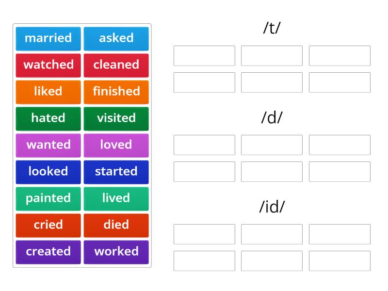 /t/: asked, liked, watched, looked, worked, finished, /d/: cried, lived, cleaned, loved, died, married, /id/: started, hated, painted, wanted, visited, created,