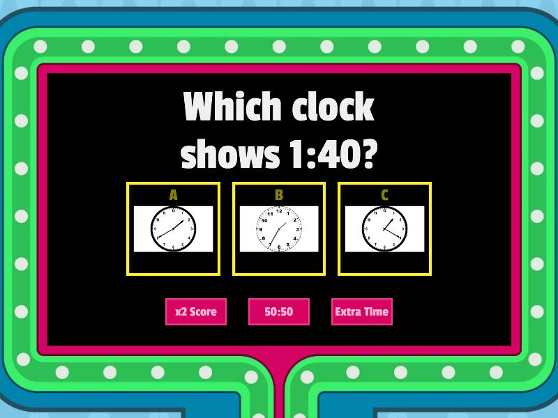 1) Which clock shows 1:40? a) b) c) 2) Which clock shows 10:55 a) b) c) 3) Which clock shows 4:35 a) b) c) 4) Which clock shows 7:50? a) b) c) 5) Which clock shows 2:40? a) b) c) 6) Which clock shows 3:45? a) b) c) 7) Which clock shows 12:50 a) b) c) 8) Which clock shows 6:45 a) b) c) 9) Which clock shows 2:35? a) b) c) 10) Which clock shows 1:05? a) b) c)