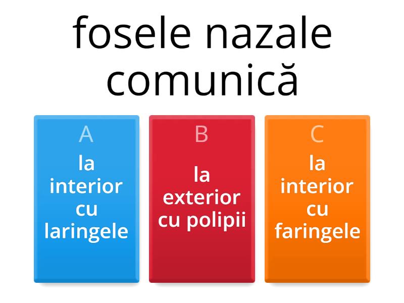 1) fosele nazale comunică a) la interior cu laringele b) la exterior cu polipii c) la interior cu faringele 2) amigdalele a) sunt în număr de trei b) se găsesc în zona traheei c) au rol în reţinerea agenţilor patogeni 3) faringele a) este cale comună cu sistemul digestiv b) prezintă inele cartilaginoase c) prezintă corzi vocale 4) bronhiile principale a) se ramifică în plămâni formând arborele bronşic b) se ramifică în bronhiole c) sunt acoperite de două foiţe numite pleure 5) plămânii a) sunt situaţi în cavitatea abdominală b) prezintă câte trei lobi c) au culoare roz şi aspect buretos 6) plămânul drept prezintă ..... lobi a) 2 b) 3 c) 4 7) nu face parte din sistemul respirator a) laringele b) Bronhia c) branhia 8) mărul lui Adam este  a) un os b) un cartilaj al laringelui c) o parte a gâtului 9) respiraţia pulmonară implică a) transportul gazelor respiratorii la nivelul mitocondriilor b) transportul gazelor respiratorii prin intermediul sângelui c) schimbul de gaze la nivelul alveolelor pulmonare 10) inspiraţia şi expiraţia sunt procese ale a) respiraţiei sanguine b) respiraţiei pulmonare c) respiraţiei celulare 11) care din următoarele afirmaţii referitoare la expiraţie este falsă a) expiraţia este procesul invers inspiraţiei b) aerul cu dioxid de carbon este eliminat din plămâni c) volumul cutiei toracice se măreşte 12) câte bronhii secundare se află în fiecare plămân a) 1 în plămânul drept, 1 în plămânul stâng  b) 2 în plămânul drept, 3 în plămânul stâng c) 3 în plămânul drept, 2 în plămânul stâng 13) respiraţia anaerobă a) se realizează în prezenţa oxigenului b) produce o cantitate mică de energie c) se întâlneşte la majoritatea organismelor 14) la plante precum trestia, schimbul de gaze are loc la nivelul stomatelor care se află  a) pe epiderma superioară a frunzei b) pe ambele feţe ale frunzei c) pe epiderma inferioară a frunzei 15) Organ al vorbirii a) Faringe b) Laringe c) Cavitate bucală 16) Delimitează cutia toracică de cavitatea abdominală  a) Coastele b) Stomacul c) Mușchiul diafragm 17) Dilatarea esofagului în timpul deglutiție este permisă de prezența inelelor cartilaginoase incomplete ale a) Laringelui b) Traheei c) Faringelui 18) Alcoolul etilic este produsul rezultat în  a) Fermentația lactică b) Fermentația acetică c) Fermentația alcoolică   19) Respiraţia prin trahei este specifică a) peştilor b) insectelor c) amfibienilor 20) Amfibienii au a) respiraţie cutanată b) respiraţie pulmo-cutanată c) respiraţie branhială