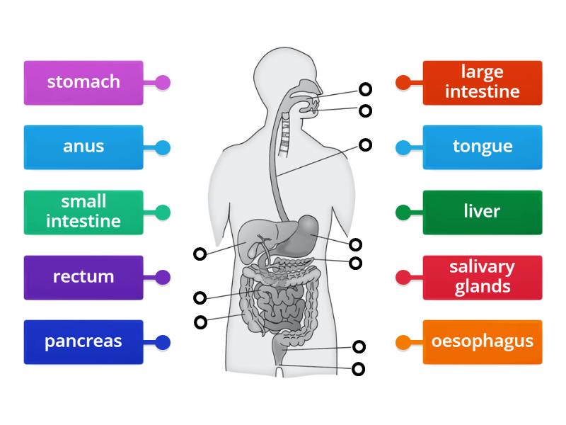 tongue, salivary glands, oesophagus, liver, stomach, pancreas, small intestine, large intestine, rectum, anus.
